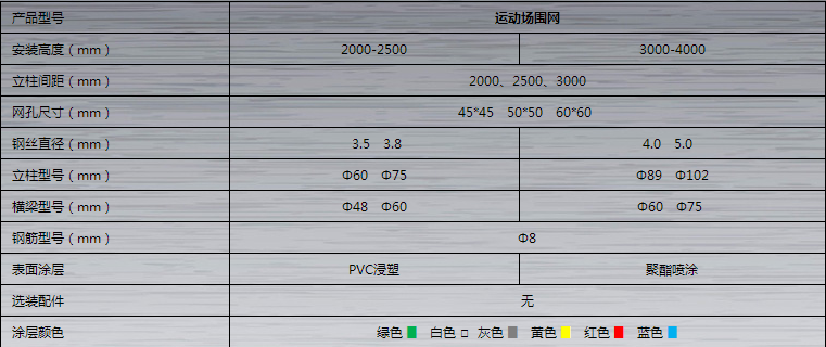 體育場圍網(wǎng)具有防腐、防老化、抗曬、耐候、色彩鮮亮、網(wǎng)面平整,強力張緊,不易受外力撞擊變形、現(xiàn)場施工安裝、靈活性強(可根據(jù)現(xiàn)場要求隨時調整造型和尺寸)的有點。可選顏色:藍色、綠色、黃色、白色等。