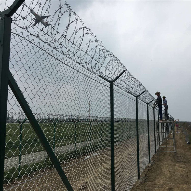 鋼絲機場圍界網機場防攀爬圍界網機場圍界圍欄網工程:飛機場、軍事領地、國境邊界、和居民區都需要安裝機場圍界網。鐵絲機場圍界網可以結合不同的應用環境顏色形狀,可以更好地與周圍環境融合,不僅可以起到基本的防護隔離效果,還可以形成一非常美麗的城市風景線,對公共環境具有裝飾和美化效果,還可以使空間更加透明。重要的是,安裝過程非常簡單,組裝施工工作效率非常快,工作效率大大提高,因此可以降低施成本和人工費用 ,這也將再次降低機場圍界網的單價。