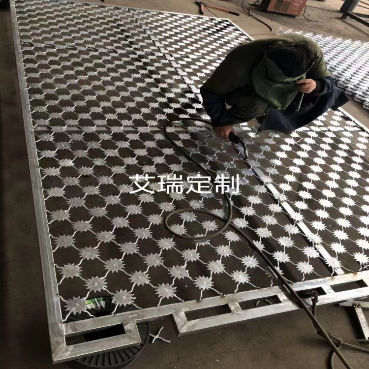 1.梅花刺片:梅花刺片直徑不小于7.0cm (直徑6cm. 7cm. 8cm ) , 刺片厚1.2mm ,采用Q235低碳鋼板沖壓成型。梅花刺片用氬弧焊將梅花刺片焊接在美格網(wǎng)的節(jié)點(diǎn)上,形成剌形保護(hù),有效的防止了手握腳攀。