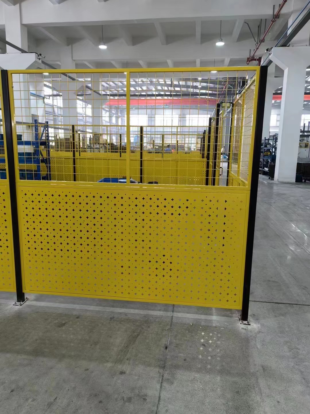 車間隔離護欄網的網體采用卡扣式鋼架灌縫網格,有高度的透明度,不會對車間內部的視線造成影響,減輕視覺壓力,使得車間的空間感覺更加舒適。