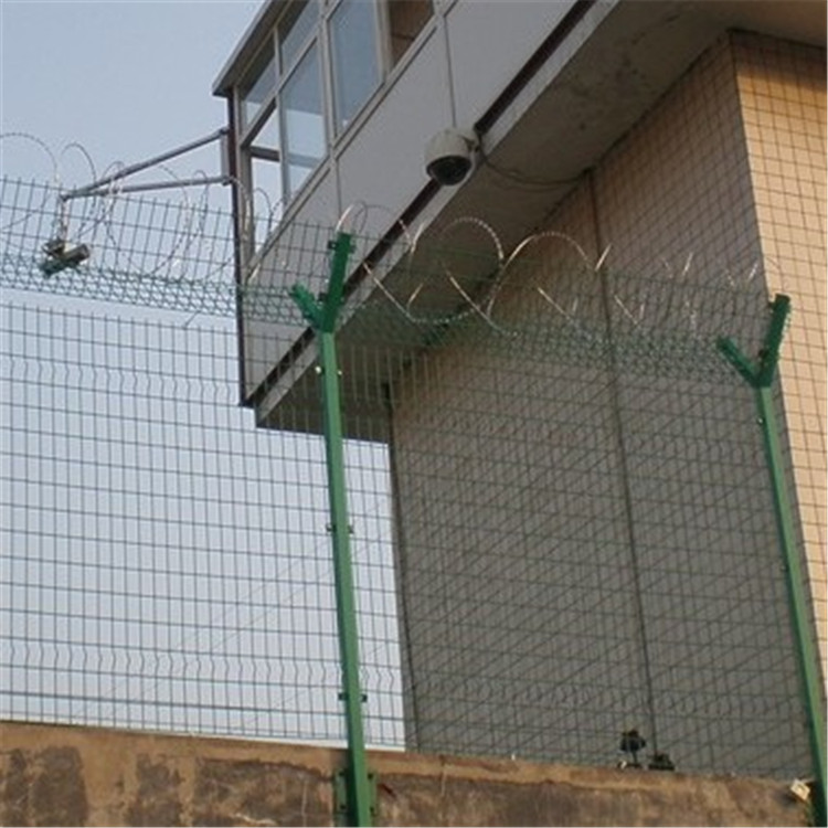 監獄鋼網墻是一種新型保護網,由刀片,刀尖,鋼絲交織而成。監獄鋼網墻有警戒的效果,原料強,強度高,張力高,防翻越,防爬等設計獨特的設計,使人不敢觸摸,所以它可以達到恐嚇的效果,更有良好的保護屏障影響。