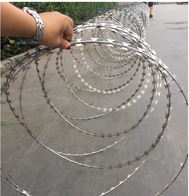 刀片刺網,是一種近年發展起來的防護、隔離能力較強的防護產品,采用優質鋼片沖壓尖刺包裹高強度鋼絲壓制而成,雙線用卡扣銜接固定,呈現螺旋型。世界各國已將刀片刺網廣泛用于軍事重地、監獄、政府機關、銀行、生活小區圍墻、私人住宅、別墅圍墻、鐵路柵欄加高以及邊境線等的安全防護。