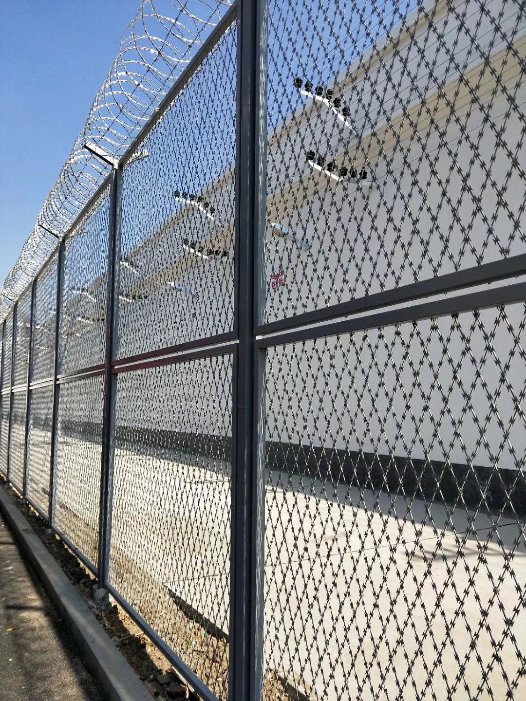 防御性級別很高。監(jiān)獄鋼網(wǎng)墻頂部加裝刀片剌絲、刀片刺繩后很好的增強(qiáng)了安全防護(hù)性能。